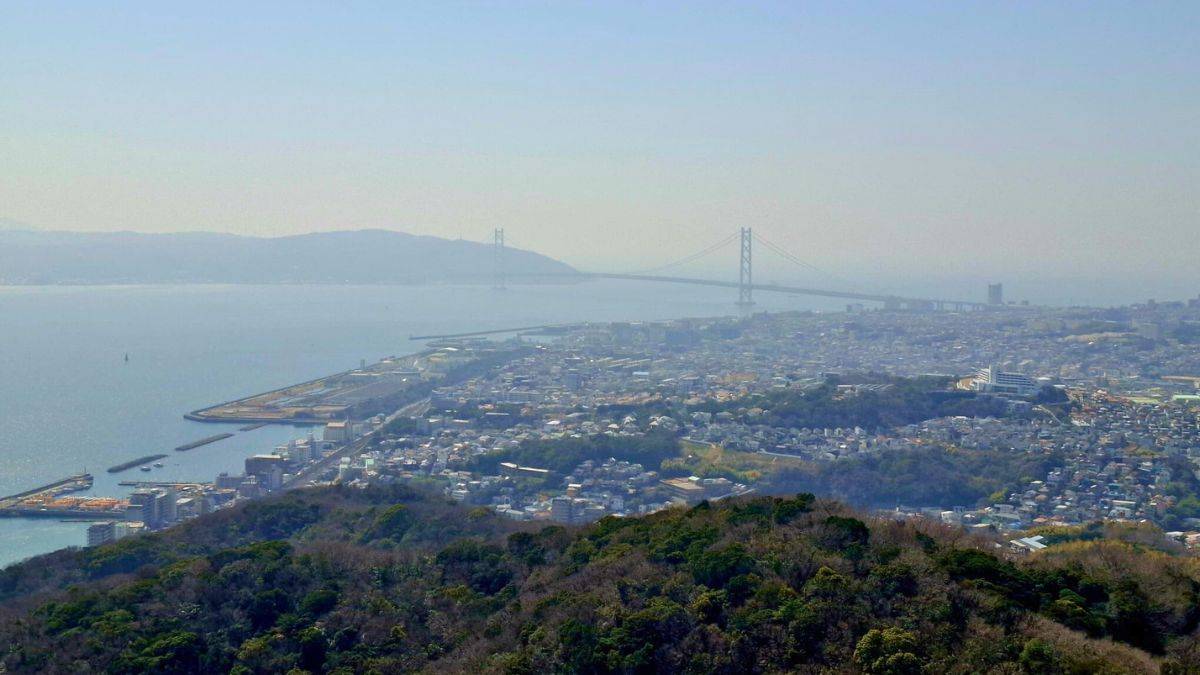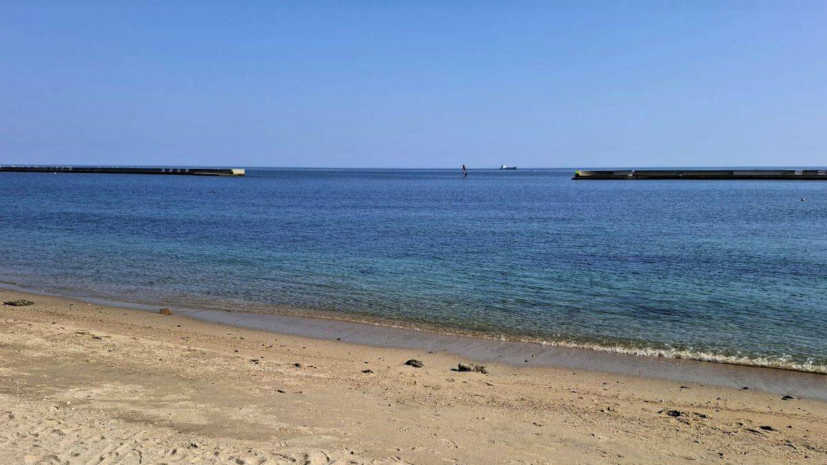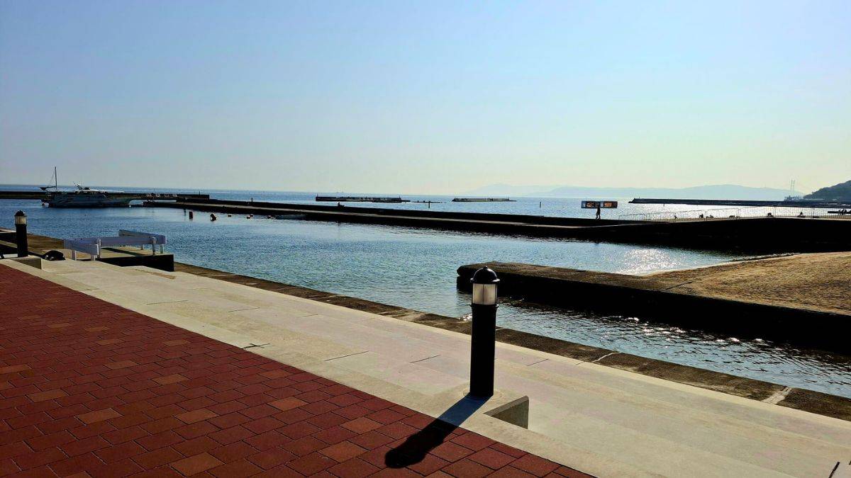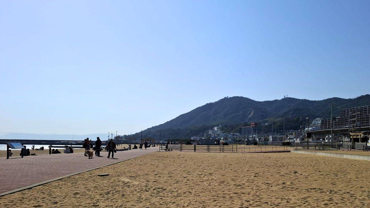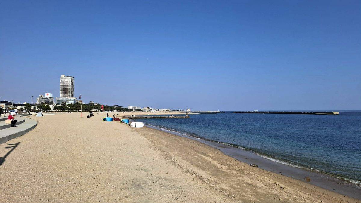 Heute lachen Badegäste unter bunten Schirmen, moderne Cafés säumen die Promenade und die Akashi-Kaikyo-Brücke glitzert am Horizont. Außerhalb der Badesaison verbringen Locals hier ihre Freizeit – mit Snacks von Imbissen und Blick aufs Meer.